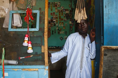 A boy stands in the doorway to his family’s shop in the rebel-held town of Ndele in the Central African Republic